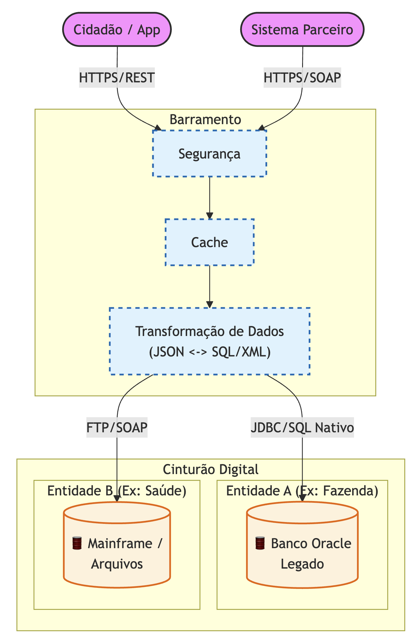 - Desacoplamento entre a API exposta e o esquema físico do banco de dados. O barramento deve ocultar a complexidade das tabelas e consultas SQL.