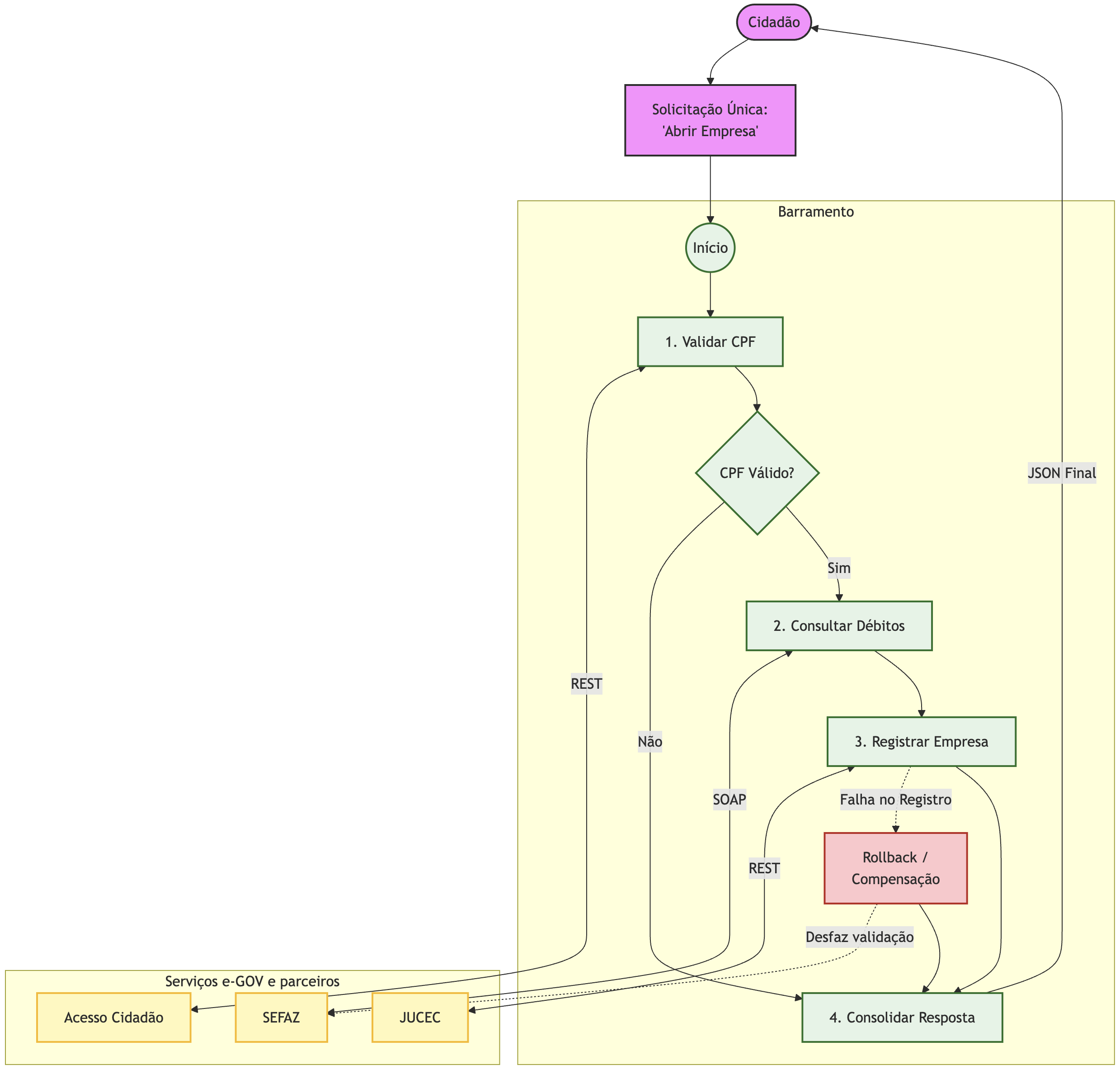 - Capacidade de disparar múltiplas requisições paralelas para diferentes entidades, aguardar todas as respostas e consolidá-las em uma resposta única para o cidadão.